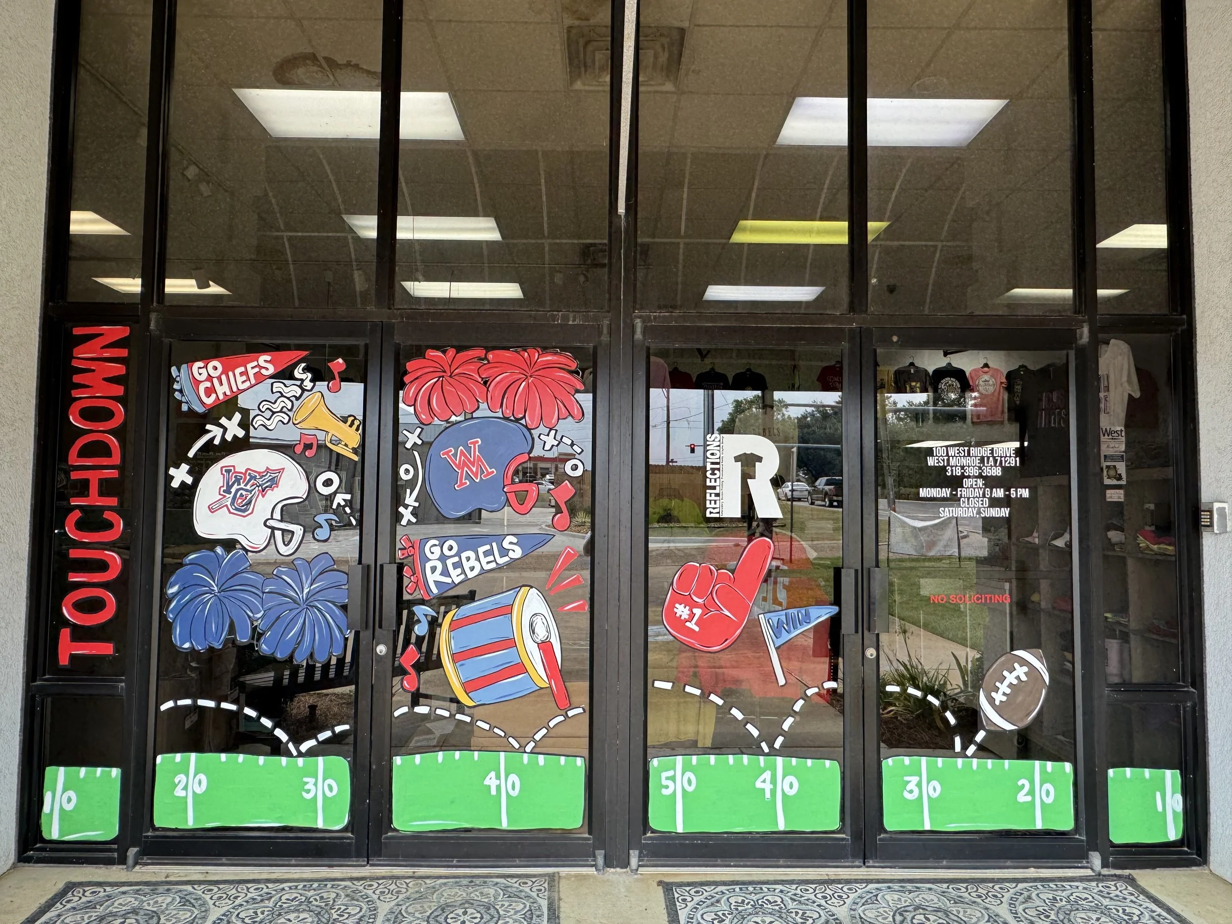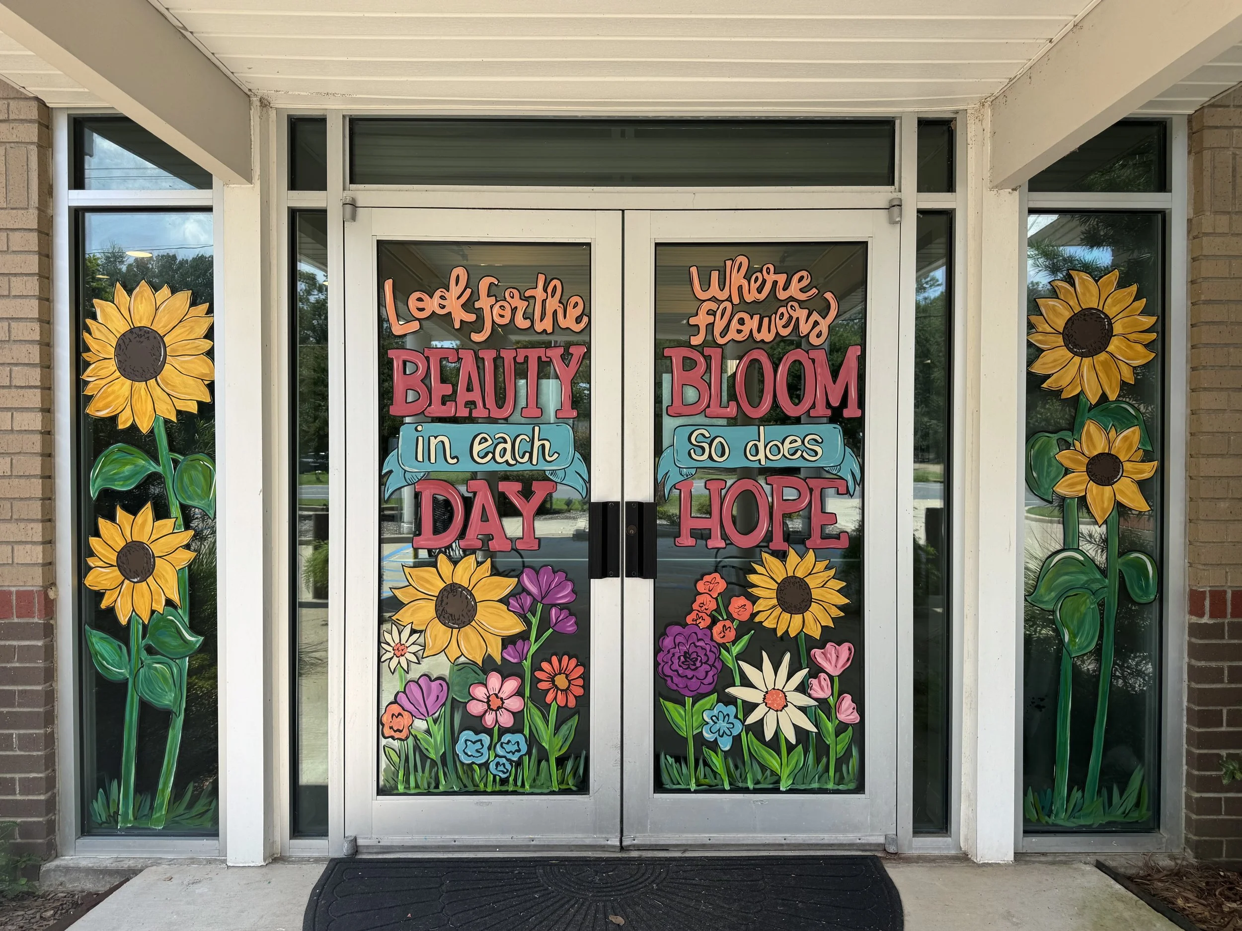 What began as painting seasonal doors at my kids’ school has grown into creating bright, custom designs for schools, churches, and local businesses. I love helping businesses stand out and connect with their customers through fun, eye-catching window displays that make people smile and stop in!